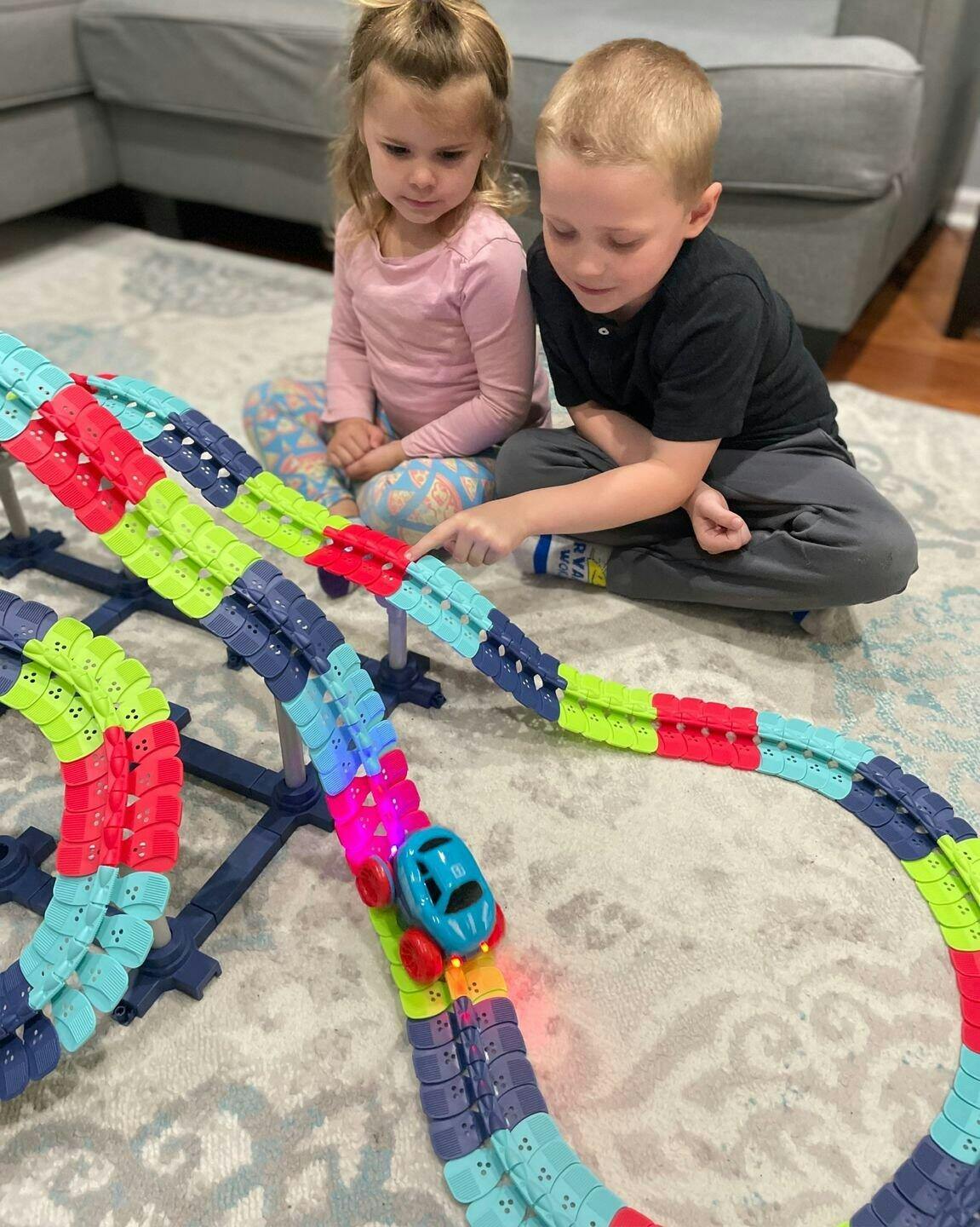 Answer 1: This exciting racing track set is designed for children aged 3 to 10 years, making it perfect for toddlers, preschoolers, and older kids who love imaginative play and racing challenges.